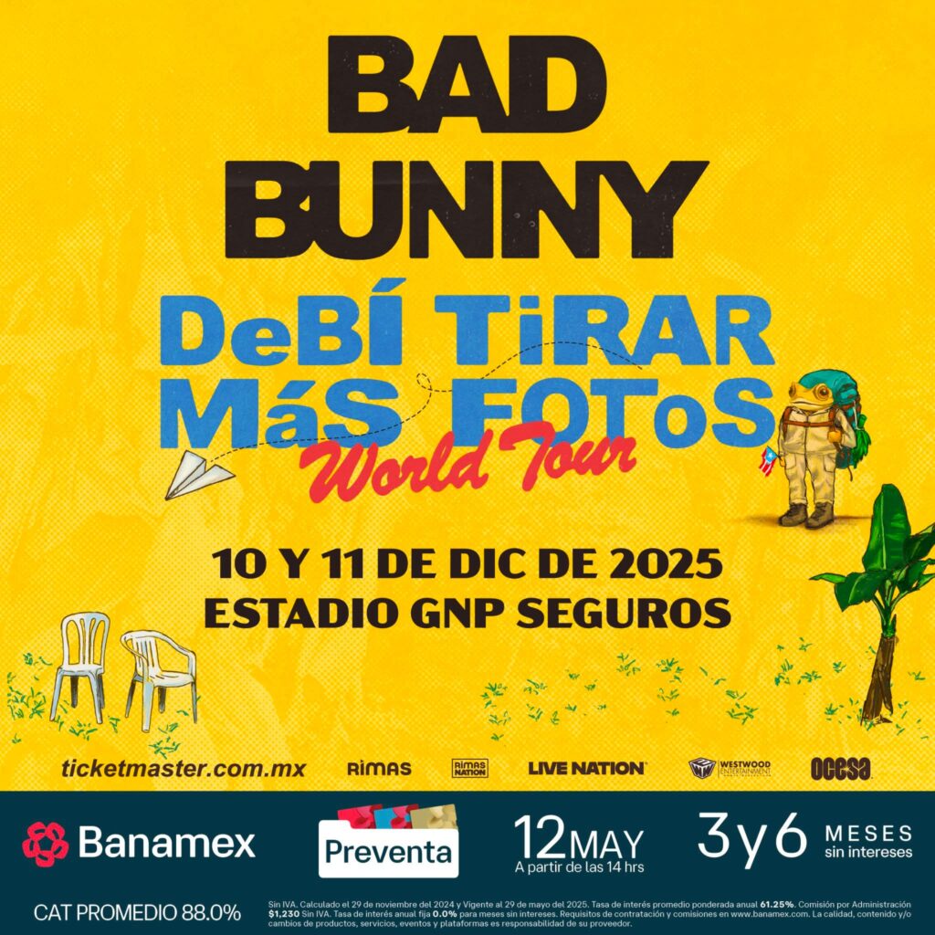 México tendrá dos fechas en el Estadio GNP Seguros de la Ciudad de México, el 10 y 11 de diciembre de 2025. La preventa Banamex se llevará a cabo el 12 de mayo, mientras que la venta general estará disponible un día después en taquillas y en ticketmaster.com.mx. Bad Bunny inicia aquí una nueva etapa, reafirmando su estatus como uno de los artistas más influyentes del mundo.